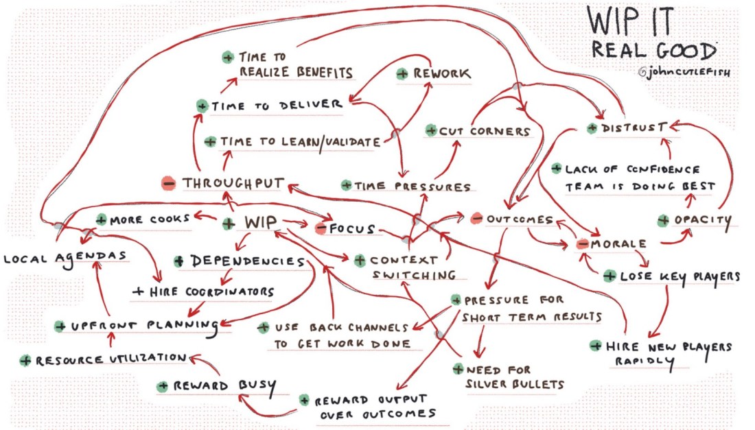 - In an environment accustomed to high WIP, well-meaning people will have optimized for the wrong things w/ coping mechanisms (ex. optimizing handoffs, “getting ahead” as opposed to just being involved, rationing out peoples’ time and attention, “red-yellow-green” status updates)