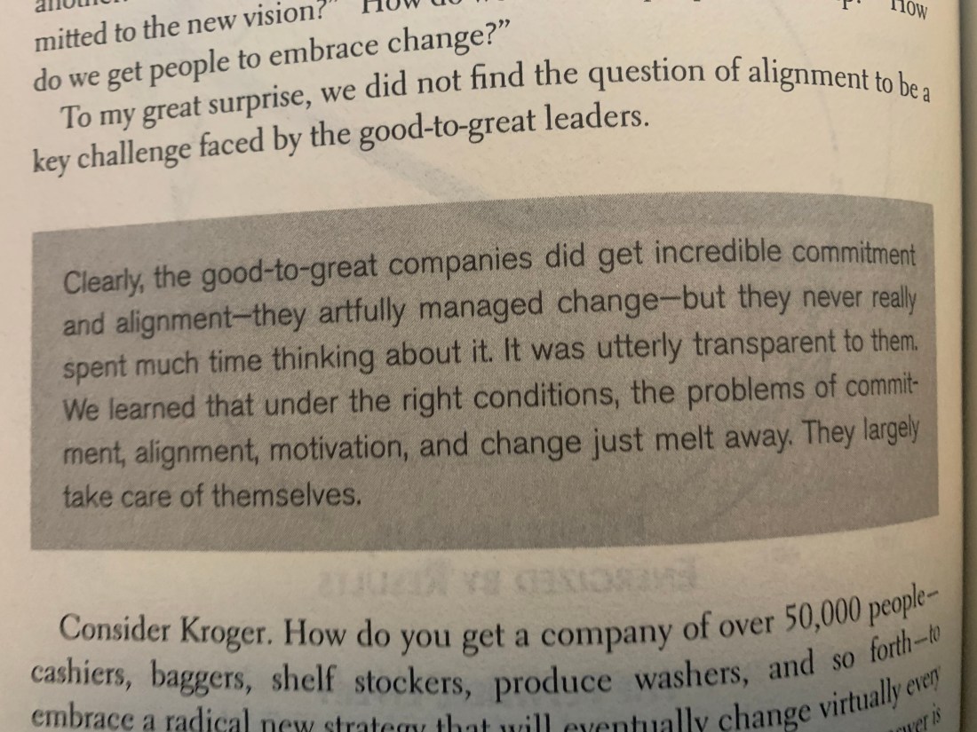 - “Building alignment” just isn’t really a thing with these companies. It’s not about persuading people to a new vision. No name, program, or fanfare for their transformations. Instead, it was about taking clear consistent steps forward with visible results.